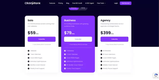 ClickRank lists tiered pricing aimed at solos, growing businesses, and agencies. Pricing has changed occasionally, so check the official page — here’s the structure as published on the site: