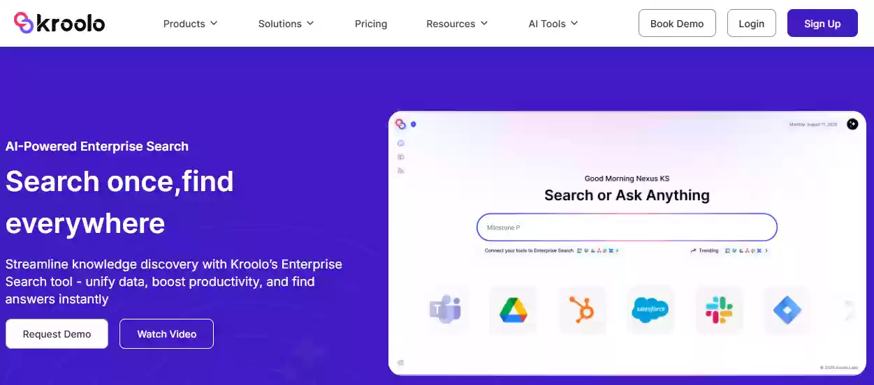 Kroolo is a next-generation AI-powered WorkOS that consolidates collaboration, project management, document handling, and AI-powered enterprise search task management into a unified platform. As an all-in-one workspace solution, it's powered by 100% authentic AI agent capabilities to streamline every aspect of team productivity.