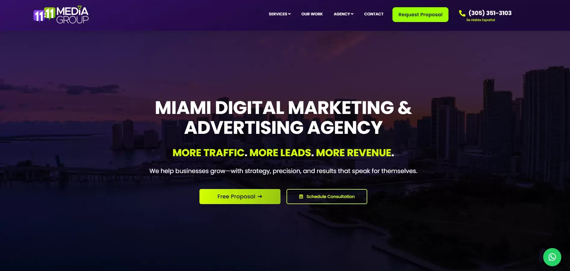 1111 Media Group is a full-service Miami marketing agency with SEO, PPC, web design, content creation, digital PR, GMB management, reputation management, and social media services. It also shows case-study style proof on its site, which matters because good SEO vendors should show work, not just promises.