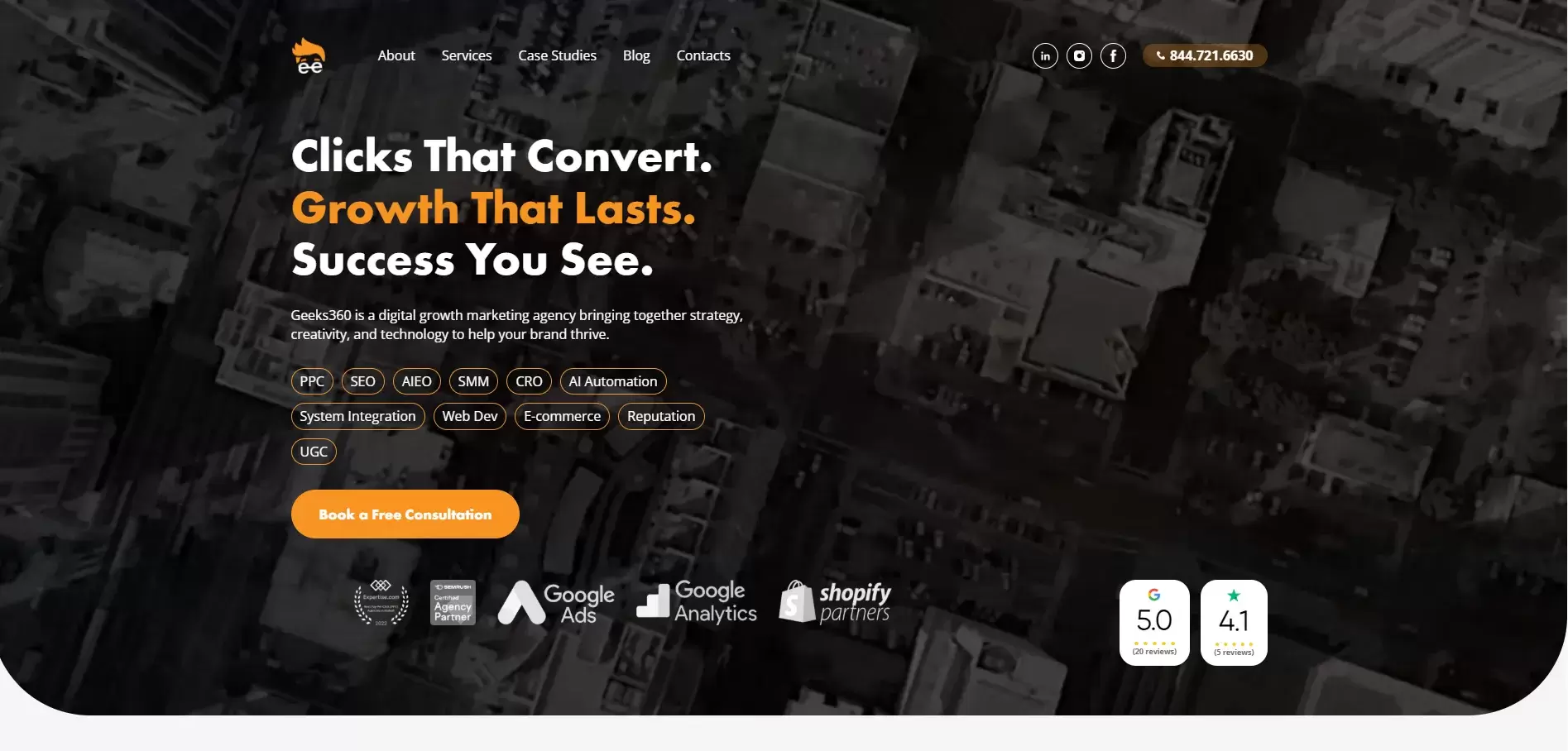Geeks360 presents itself as a digital growth marketing agency with SEO, AIEO, PPC, CRO, AI automation, system integration, web development, e-commerce, reputation management, and UGC support. It also shows Miami office presence, along with other US locations, which makes it useful for brands that want a larger multi-market team with search as part of a wider growth stack.