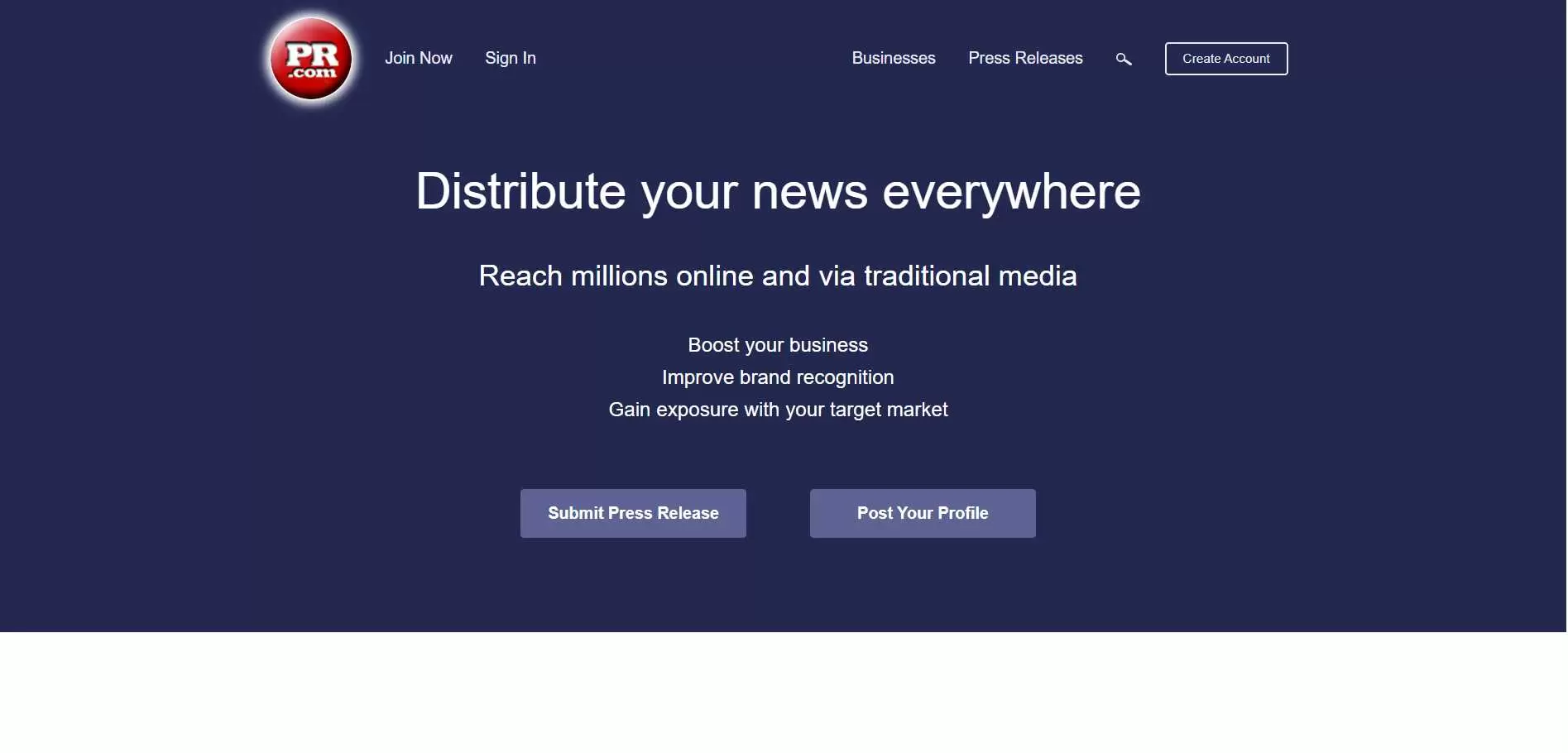 PR.com offers both free and paid press release distribution, and it pushes the idea of wide syndication across media outlets, social media, major newsrooms, and more. Its pricing page indicates bulk and service-based options, while its main site positions the platform as a way to increase visibility, attract customers, and expand reach.