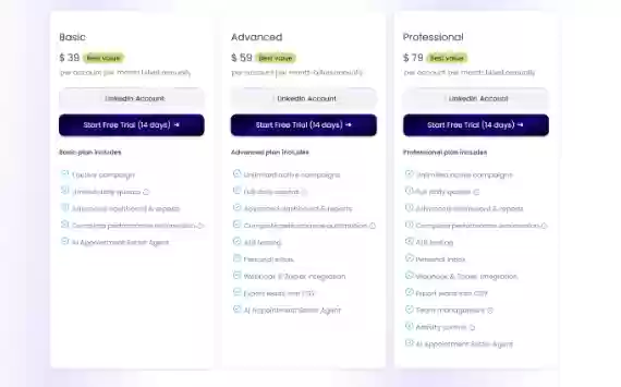 SalesRobot offers tiered plans based on the number of LinkedIn accounts and billing cycle. All plans include unlimited LinkedIn outreach campaigns, templates, reports, and the AI appointment-setting assistant. You can try any plan free for 14 days (no credit card required). Pricing (per LinkedIn account) is as follows: