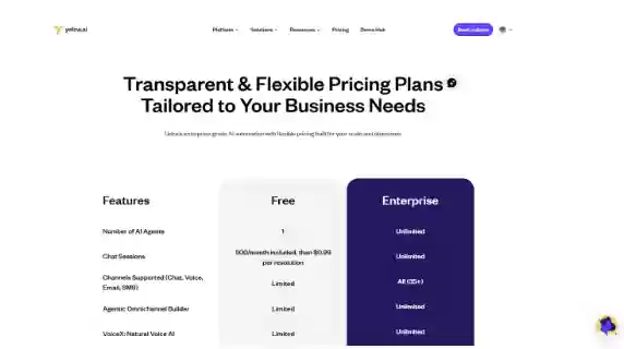 Yellow.ai uses a custom, usage-based enterprise pricing model rather than simple public tiers. Their site emphasizes demos, an ROI calculator, and tailored plans for Service and Commerce Clouds. Expect to contact sales for accurate pricing.